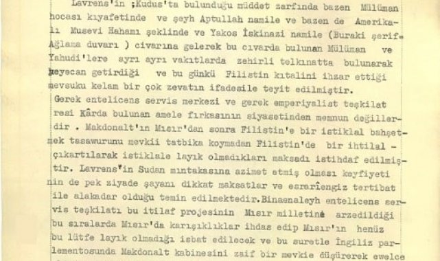Gerek entelicens servis merkezi ve gerek emperiyalist teşkilat resi karda bulunan amele fırkasının siyasetinden memnun değillerdir. Makdonalt'ın Mısır'dan sonra Filistin'e bir istiklal bahşetmek tasavvurunu mevkii tatbika koymadan Filistin'de bir ihtilal çıkartılarak istiklale layık olmadıkları maksadı istihdaf edilmiştir. Lavrens'in Sudan mıntakasına azimet etmiş olması keyfiyetinin de pek ziyade şayanı dikkat maksatlar ve esrarengiz tertibat ile alakadar olduğu temin edilmektedir. Binaenaleyh entelicens servis teşkilatı bu itilaf projesinin Mısır milletine arz edildiği bu sıralarda Mısır'da karışıklıklar ihdat edip Mısır'ın henüz bu lütfa layık olmadığı isbat edilecek ve bu suretle İngiliz parlamentosunda Makdonalt kabinesini zaif bir mevkie düşürerek evvelce olduğu veçhile Mısır'ın sinesine bağdaş kurup oturacaktır. Mısır'da karışıklıklar ihdas ve tertip için en iyi vasat şimdiki halde Sudan'dır. Sudan'da halihazırda yalnız İngiliz idaresi ve emperiyalist amalile meşbu İngiliz idare adamları ve Sudan'ın daimi bir surette Mısır'la ittisalı bulunduğundan Sudan'da Mısır için pek emin olarak bir suikastın ihzarı ve talim edilmiş ajanların Mısır'a ithal edilip menfi propagandalar ve tahribat yapılması pek basit bir keyfiyettir."