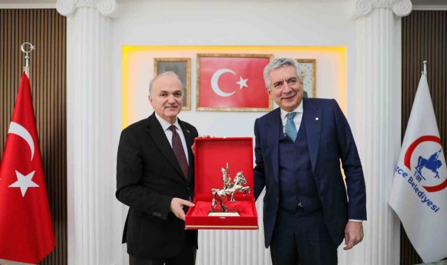 Düzce Belediye Başkanı Dr. Faruk Özlü, bir dizi temaslarda bulunmak için kente gelen İstanbul Sanayi Odası (İSO) Başkanı Erdal Bahçıvan ile makamında bir araya geldi.