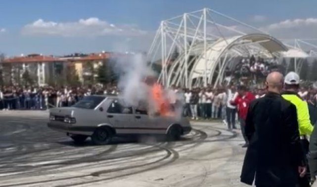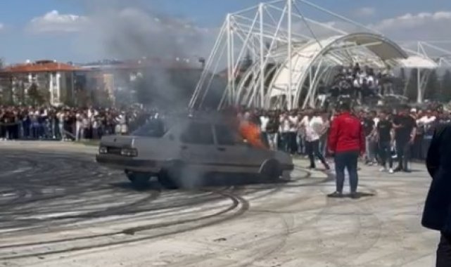 Isparta'da modifiye araç festivalinde drift atan Tofaş marka otomobil aniden alev aldı. Sürücü yangın tüpüyle müdahale ederek aracı söndürürken, izleyiciler arasında panik yaşandı.