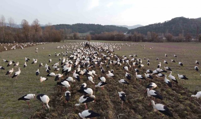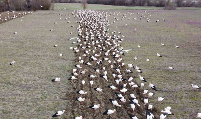 Baharın habercisi leylekler, göç yolculuklarına başladı. Soğuk bölgelerden sıcak bölgelere göç eden yüzlerce leylek, Mudurnu ilçesi Munduşlar köyünde mola verdi. Tarlasını süren bir vatandaşın, 5 dönüm arazisine yüzlerce leylek kondu. İşlenen topraktan çıkan böcek ve tohumları yiyen yüzlerce leylek, 5 dönümlük arazide adım atacak yer bırakmadı. Burada bir süre hem beslenen hem de dinlenen leylekler, daha sonra göçe devam etti.