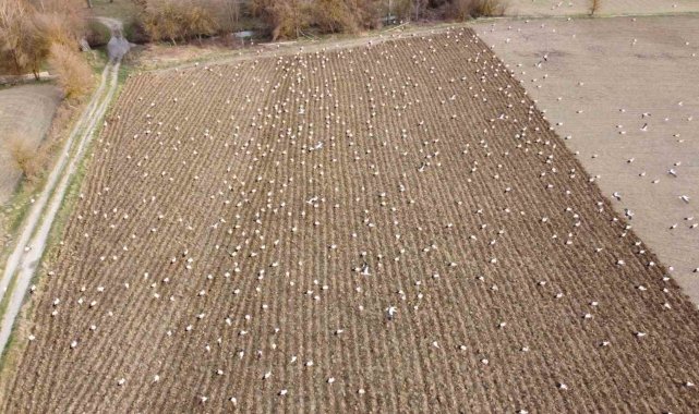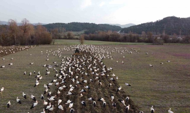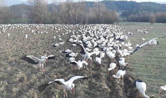 Bolu'da baharın müjdecisi yüzlerce leylek, mola verdikleri 5 dönümlük tarlada adım atacak yer bırakmadı.