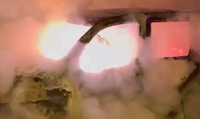 Motor kısmı alev alan araç saniyeler içinde ateş topuna döndü