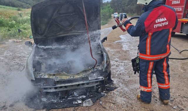 Tokat'ın Erbaa ilçesinde seyir halindeyken alev alan otomobil, itfaiye ekiplerince söndürülmesine rağmen kullanılamaz hale geldi.