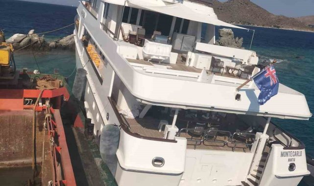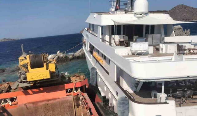 Muğla'nın Bodrum ilçesinde kayalıklara çarpan 39 metre boyundaki motoryatı kurtarma çalışmaları sürüyor.