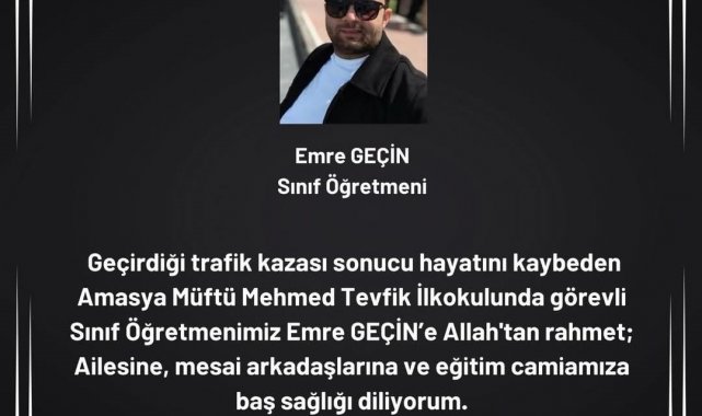 Geçtiğimiz 11 Nisan'da Sarılar köyü kavşağı mevkiinde yağış nedeniyle ıslanan yolda motosikletiyle geçirdiği trafik kazasında ağır yaralanarak kaldırıldığı hastanede yoğun bakım ünitesinde tedavi gören Müftü Mehmet Tevfik İlkokulu öğretmeni Emre Geçin (42), 35 günlük yaşam mücadelesini kaybetti.
