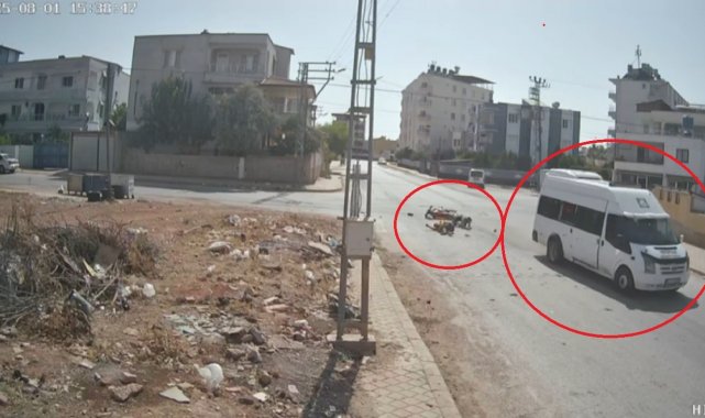 Hatay'da motosikletin, minibüsle çarpışmasıyla 2 kişinin yere savrulduğu anlar kameraya yansıdı.