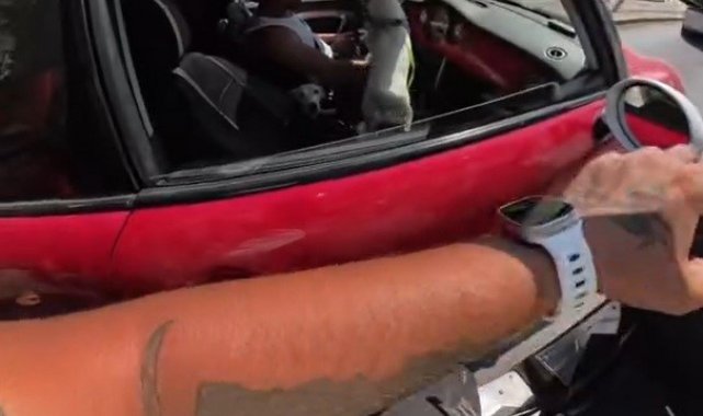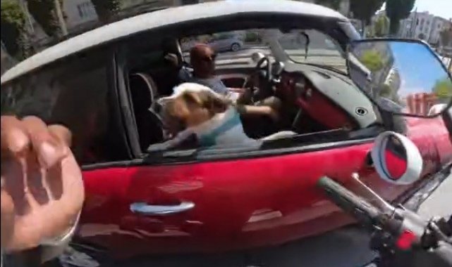 Eskişehir'de işlek bir caddede seyreden bir motosiklet sürücüsü, trafikte beklerken yanında bulunan araç içindeki köpeği sevmek için açık camdan hamle yapınca, sevimli hayvanın 2 kez hırlamasıyla irkildi. Kask kamerasına yansıyan gülümseten olay sonrası, motosiklet sürücüsü araçtan hızla uzaklaştı.