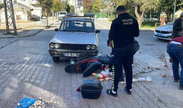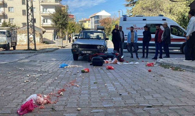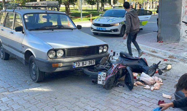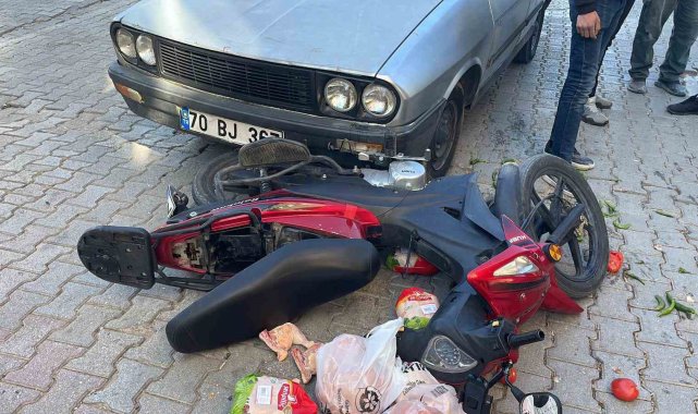 Karaman'da otomobil ile çarpışan motosikletin sürücüsü yaralanırken, poşetlerdeki sebzeler yola saçıldı.
