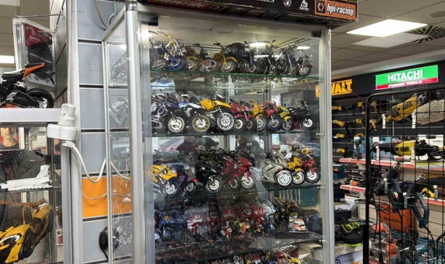 Düzce'de nalbur ve hırdavat üzerine esnaflık yapan Aydın Çetinkaya, 30 yıldır biriktirdiği motosiklet maketlerini iş yerindeki özel vitrinde sergiliyor.