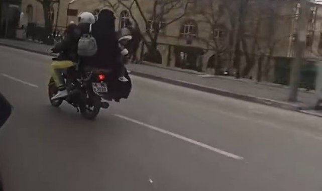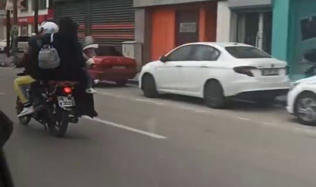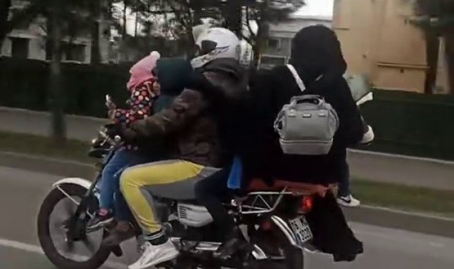 Bursa'da bir aile, motosiklete 6 kişi binerek ilerlemeye başladı. Merkez Yıldırım ilçesi Ankara Yolu Caddesi Duaçınarı mevkiinde seyir halinde olan motosikleti gören diğer sürücüler, tehlikeli anları saniye saniye amatör kamera ile kayda aldı. 6 kişilik ailenin tehlikeli motosiklet yolculuğu kamerada.