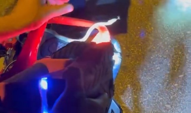 Park halindeki bir motosikletin içine giren yılan, çevredekileri endişeye sevk etti. İhbar üzerine olay yerine gelen itfaiye ekiplerinden bir er, büyük bir soğukkanlılık ve cesaretle motosikletin içine giren yılanı aramaya başladı. Dar alanlara elini korkusuzca uzatan itfaiye eri, motosikletin motor kısmında saklanan yılanı büyük bir ustalıkla çıkardı. O anlar çevredeki vatandaşlar tarafından saniye saniye kaydedildi. İzleyenler, özellikle itfaiye erinin hiçbir koruyucu ekipman kullanmadan gösterdiği cesarete hayran kaldı.