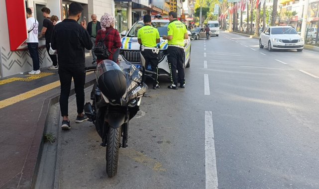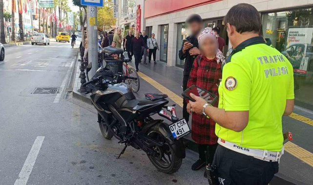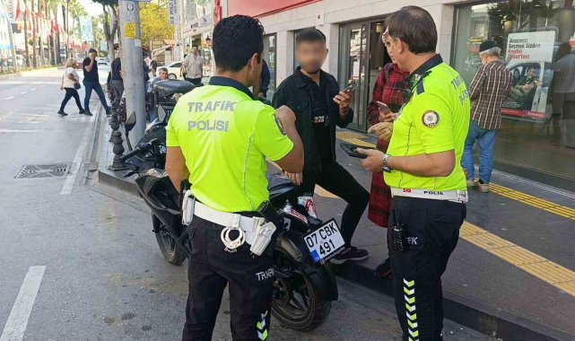 Manavgat ilçesi Antalya Caddesi'nde devriye görevi ifa eden Manavgat İlçe Emniyet Müdürlüğü Trafik Denetleme Büro Amirliği ekipleri, seyir halindeki plakası okunamayacak şekilde bandana ile kapatılmış motosikleti durdurdu. Trafik ekiplerinin yaptığı kontrolde motosikleti kullanan Erdem C.'nin sürücü belgesinin olmadığı, kaskı yanında olmasına rağmen takmadığı ve aynaları kapattığı belirlendi. Motosiklet sürücüsü ve motosiklet sahibine toplam 43 bin 149 TL para cezası uygulandı.