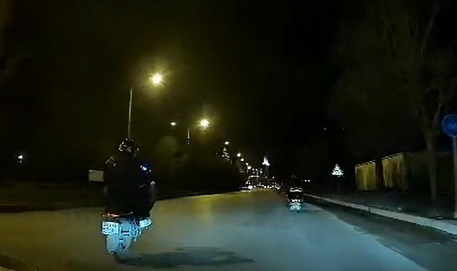 Eskişehir'de bir bulvarda önünü kaldırarak ilerleyen motosikletin sürücüsü, otomobilin araç içi kamerasına anbean yansıdı.