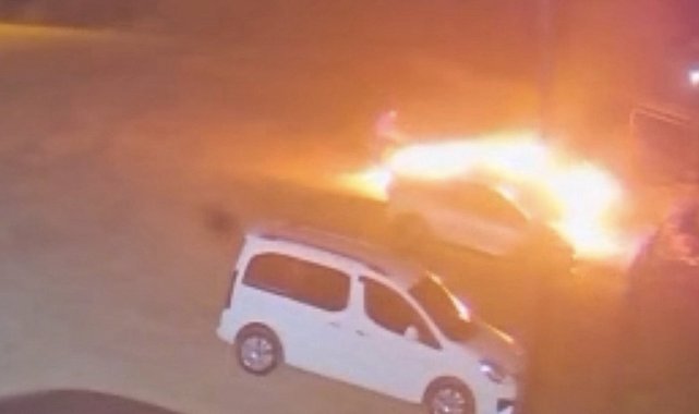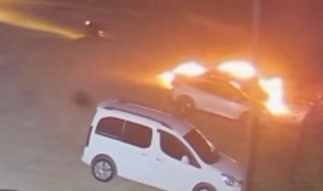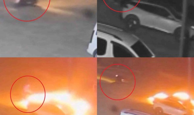 Olay anı ise saniye saniye güvenlik kamerasına yansıdı. Görüntülerde, kafasında kask bulunan motosikletli bir şahsın gelerek, yanıcı maddeyi aracın üzerine döktüğü ve ateşe verdiği anlar yer aldı.