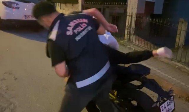 Edinilen bilgilere göre, Samsun İl Emniyet Müdürlüğü Narkotik Suçlarla Mücadele Şube Müdürlüğü ekipleri, uyuşturucu ticaretini önlemeye yönelik yürüttükleri çalışmalar kapsamında Canik ilçesinde geniş çaplı bir operasyon düzenledi. Narkotik polisi, 16 yaşındaki H.H.E.'yi takibe aldı. Şüphelinin, 20 yaşındaki K.K.'ye çarşafa sarılı paket teslim ettiği belirlendi. Motosikletle ayrılan K.K., kısa süre sonra kovalamaca sonucu yakalandı. Polisin motosiklet üzerindeki şüphelinin üzerine atlayarak etkisiz hale getirdiği anlar polis kamerası tarafından kaydedildi. Çarşaftan çıkan pakette 7 bin 497 adet sentetik ecza hap bulundu.