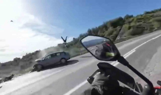 Bursa'nın İznik ilçesi ile Sakarya Pamukova arasındaki karayolunda hatalı sollama yapan motosiklet sürücüsü otomobille çarpıştı. 59 yaşındaki motosiklet sürücüsü hayatını kaybederken, kaza anı başka bir motosikletin kask kamerasına saniye saniye yansıdı.