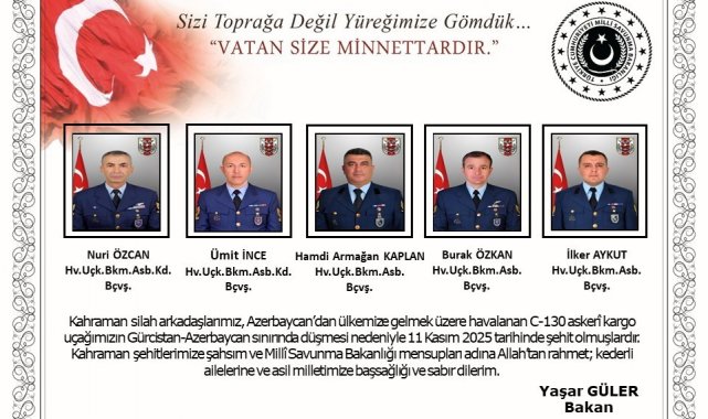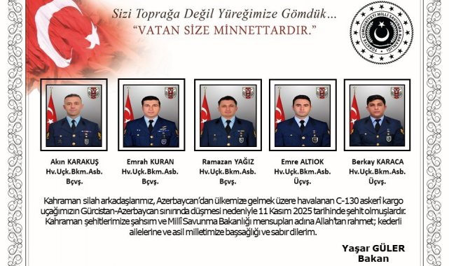 Azerbaycan'dan Türkiye'ye dönmek üzere havalanan C-130 askeri kargo uçağının Gürcistan-Azerbaycan sınırında düşmesi üzerine 20 asker şehit oldu. Şehadete eren askerlerin isimleri ise şu şekilde: "Hava Pilot Yarbay Gökhan Korkmaz, Hava Pilot Binbaşı Serdar Uslu, Hava Pilot Binbaşı Nihat İlgen, Hava Pilot Üsteğmen Cüneyt Kandemir, Hava Uçak Bakım Üsteğmen Emre Mercan, Hava Uçak Bakım Astsubay Kıdemli Başçavuş Nuri Özcan, Hava Uçak Bakım Astsubay Kıdemli Başçavuş Ümit İnce, Hava Uçak Bakım Astsubay Başçavuş Hamdi Armağan Kaplan, Hava Uçak Bakım Astsubay Başçavuş Burak Özkan, Hava Uçak Bakım Astsubay Başçavuş İlker Aykut, Hava Uçak Bakım Astsubay Başçavuş Akın Karakuş, Hava Uçak Bakım Astsubay Başçavuş Emrah Kuran, Hava Uçak Bakım Astsubay Başçavuş Ramazan Yağız, Hava Uçak Bakım Astsubay Üstçavuş Emre Altıok, Hava Uçak Bakım Astsubay Üstçavuş, Berkay Karaca, Hava Uçak Bakım Astsubay Üstçavuş Burak İbbiği, Hava Uçak Bakım Astsubay Üstçavuş İlhan Ongan, Hava İkmal Astsubay Kıdemli Çavuş Ahmet Yasir Kuyucu, Hava Ulaştırma Uzman Çavuş Cem Dolapci, Hava Ulaştırma Uzman Çavuş Emre Sayın."