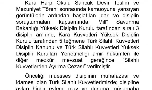 Milli Savunma Bakanlığından yapılan açıklamada, Kara Harp Okulu Sancak Devir Teslim ve Mezuniyet Töreni sonrası kamuoyuna yansıyan görüntülerin ardından başlatılan idari ve disiplin soruşturmalarına ilişkin, "Milli Savunma Bakanlığı Yüksek Disiplin Kurulu tarafından sıralı 3 disiplin amirine, Kara Kuvvetleri Yüksek Disiplin Kurulu tarafından 5 teğmene Türk Silahlı Kuvvetleri Disiplin Kanunu ve Türk Silahlı Kuvvetleri Yüksek Disiplin Kurulları Yönetmeliği amir hükümleri ile diğer mezkûr mevzuat gereğince 'Silahlı Kuvvetlerden Ayırma Cezası' verilmiştir" ifadeleri kullanıldı.