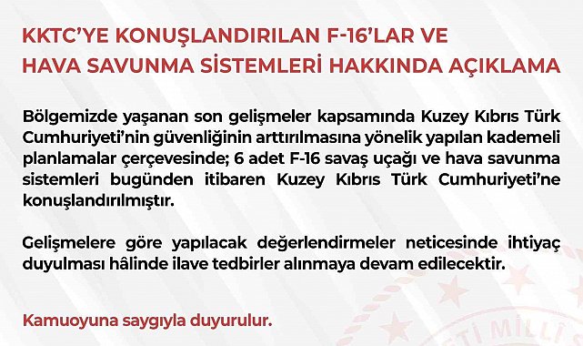 MSB, bölgedeki son gelişmeler kapsamında Kuzey Kıbrıs Türk Cumhuriyeti'nin (KKTC) güvenliğini artırmak amacıyla F-16 savaş uçağı ve hava savunma sistemi konuşlandırıldığını duyurdu. Bakanlık tarafından yapılan yazılı açıklamada, "Bölgemizde yaşanan son gelişmeler kapsamında Kuzey Kıbrıs Türk Cumhuriyeti'nin güvenliğinin artırılmasına yönelik yapılan kademeli planlamalar çerçevesinde; 6 adet F-16 savaş uçağı ve hava savunma sistemleri bugünden itibaren Kuzey Kıbrıs Türk Cumhuriyeti'ne konuşlandırılmıştır. Gelişmelere göre yapılacak değerlendirmeler neticesinde ihtiyaç duyulması hâlinde ilave tedbirler alınmaya devam edilecektir" denildi.