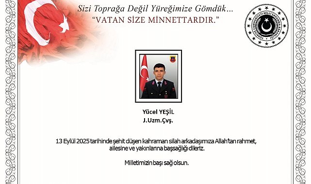 MSB tarafından Kütahya'da, yol kontrol devriyesi esnasında bir otomobilin çarpması sonucu şehit olan Jandarma Uzman Çavuş Yücel Şehit için başsağlığı mesajı yayımlandı. Mesajda, "13 Eylül 2025 tarihinde şehit düşen kahraman silah arkadaşımıza Allah'tan rahmet, ailesine ve yakınlarına başsağlığı dileriz. Milletimizin başı sağ olsun" ifadelerine yer verildi.