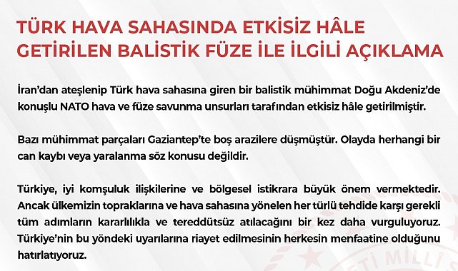 "İran'dan ateşlenip Türk hava sahasına giren bir balistik mühimmat Doğu Akdeniz'de konuşlu NATO hava ve füze savunma unsurları tarafından etkisiz hale getirilmiştir. Bazı mühimmat parçaları Gaziantep'te boş arazilere düşmüştür. Olayda herhangi bir can kaybı veya yaralanma söz konusu değildir. Türkiye, iyi komşuluk ilişkilerine ve bölgesel istikrara büyük önem vermektedir. Ancak ülkemizin topraklarına ve hava sahasına yönelen her türlü tehdide karşı gerekli tüm adımların kararlılıkla ve tereddütsüz atılacağını bir kez daha vurguluyoruz. Türkiye'nin bu yöndeki uyarılarına riayet edilmesinin herkesin menfaatine olduğunu hatırlatıyoruz."