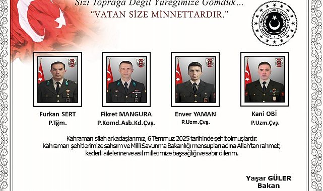 "6 Temmuz 2025 tarihinde, Pençe-Kilit Harekâtı bölgesinde 852 Rakımlı Tepe'de bölücü terör örgütü mensupları tarafından kullanılan bir mağarada icra edilen arama tarama faaliyetinde, metan gazından etkilenen dört kahraman silah arkadaşımız daha şehit olmuş, şehit olan personel sayısı on ikiye yükselmiştir. Millî Savunma Bakanı Yaşar Güler, TSK komuta kademesi ile birlikte inceleme, denetlemelerde bulunmak ve şehitlerimizin uğurlama törenlerine katılmak üzere bölgeye gitmiştir. Bizleri derin bir acı ve üzüntüye boğan bu olayda hayatını kaybeden aziz şehitlerimize Allah'tan rahmet, kederli ailelerine, Türk Silahlı Kuvvetleri ile asil milletimize başsağlığı ve sabır, etkilenenlere de acil şifalar dileriz".