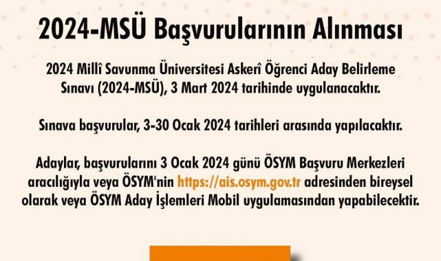Öte yandan, 2024-MSÜ Askeri Öğrenci Aday Belirleme Sınavı'na ilişkin ayrıntılı bilgi https://www.osym.gov.tr/ adresinde yer alıyor. ÖSYM sınav takvimine göre 3 Mart'ta yapılacak sınavın sonuçlarının ise 28 Mart'ta açıklanması planlanıyor.