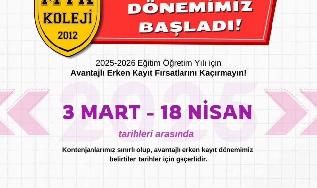MTK Koleji, kaliteli eğitimi ve donanımlı kadrosu ile öğrencilere nitelikli bir eğitim ortamı sunmayı hedefliyor. Erken kayıt fırsatlarından yararlanmak isteyen veliler ve öğrenciler, belirtilen tarihler arasında kayıt işlemlerini gerçekleştirebilirler.
