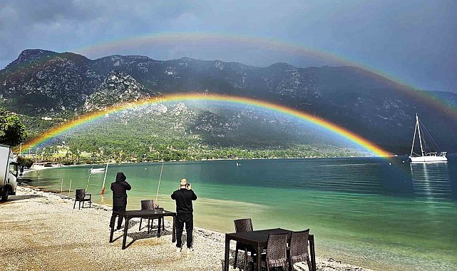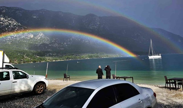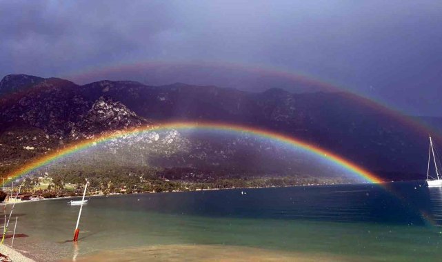 Muğla'da yağış sonrası Menteşe ilçesi sınırlarında bulunan Akbük Koyu'nda oluşan gökkuşağı, sahilde bulunan vatandaşlar tarafından görüntülendi.