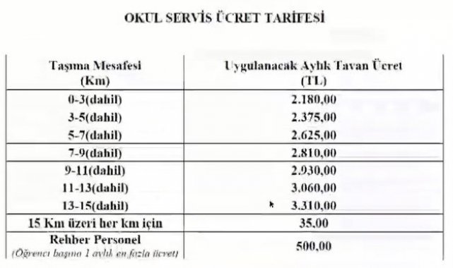 Yeni düzenlemeye göre okul servislerinin aylık tavan ücretleri şöyle oldu; 0-3 km 2 bin 180 TL, 3-5 km 2 bin 375 TL, 5-7 km 2 bin 625 TL, 7-9 km 2 bin 810 TL, 9-11 km 2 bin 930 TL, 11-13 km 3 bin 060 TL, 13-15 km 3 bin 310 TL. 15 kilometreyi aşan her kilometre için aylık 35 TL ek ücret alınacak. Ayrıca rehber personel için öğrenci başına aylık en fazla 500 TL talep edilebilecek.