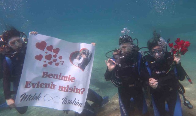 Muğla'nın Fethiye ilçesinde deniz altında dev afişle kız arkadaşına sürpriz bir evlilik teklifi yapıldı.