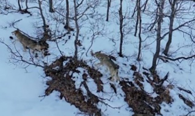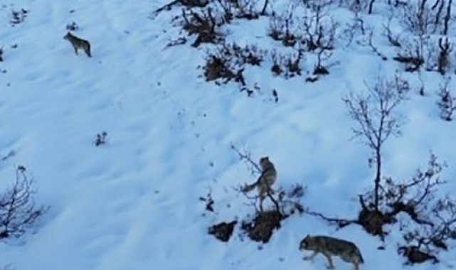 Uzun süre karlı zirvelerde yiyecek arayan kurtlar, daha sonra ormanlık alana doğru giderek gözden kaybolurken o anlar, dron ile kayıt altına alındı.