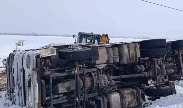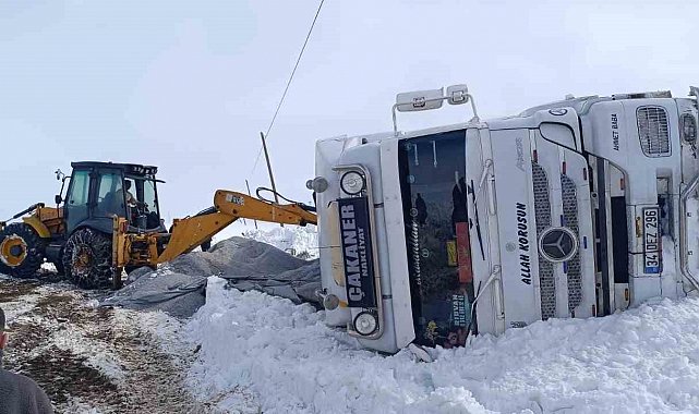 Van'ın Muradiye ilçesinde gizli buzlanmadan dolayı kontrolden çıkan tır devrildi.