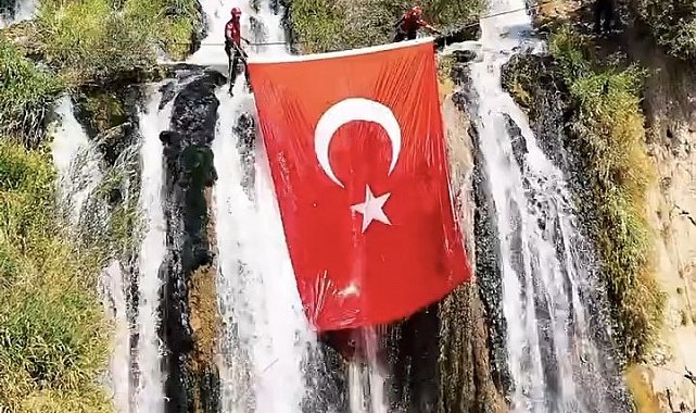 Muradiye Şelalesinde dev Türk bayrağı açıldı