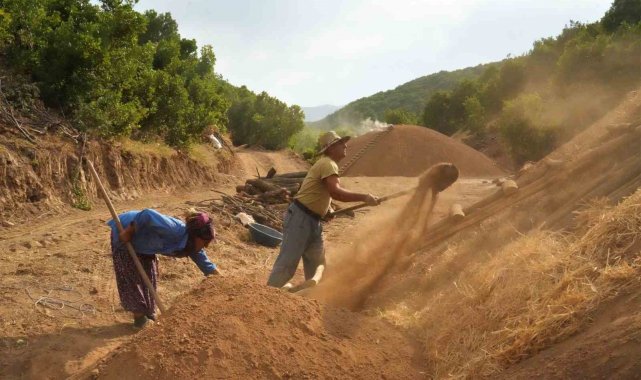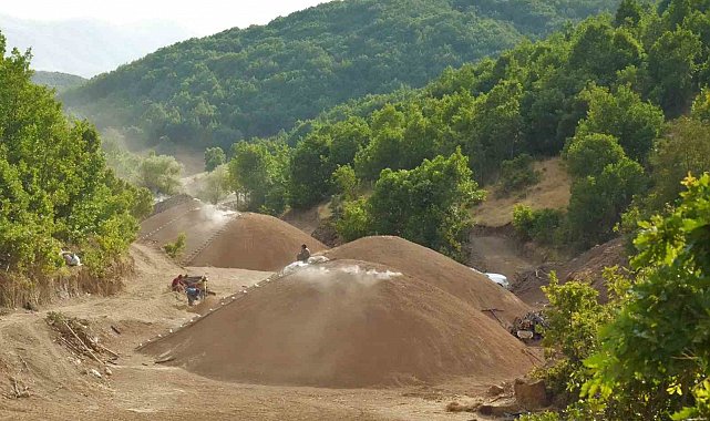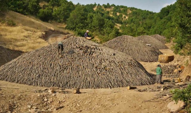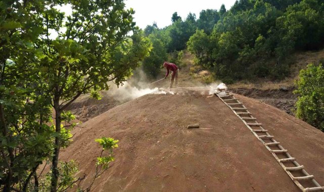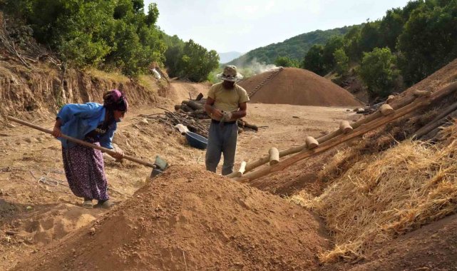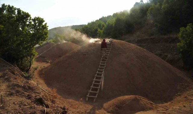 Orman İşletme Müdürlüğü tarafından belirlenen alanlarda günün ilk ışıklarıyla işe koyulan aileler, gün boyunca ateş karşısında is ve dumana aldırmadan kestikleri meşe odunlarını yakarak mangal kömürüne çeviriyor.