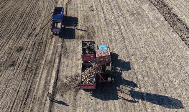 Sabahın ilk ışıklarıyla birlikte tarlalara inen çiftçiler, emeğin ve alın terinin karşılığını almak için yoğun mesai harcıyor. Yağmura ve soğuğa aldırmadan çalışmalarını sürdüren üreticiler, gün boyunca pancar sökümü, yükleme ve taşıma işlemleriyle uğraşırken, zorlu hasat süreci adeta bir dayanışma örneğine dönüşüyor. Geniş pancar tarlalarındaki hummalı çalışma dron ile havadan görüntülendi.