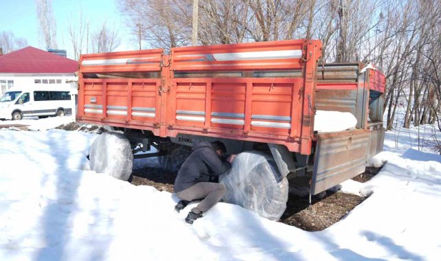 Muş'taki çiftçiler, dondurucu soğukların tarım araçlarına zarar vermemesi için traktör ve römork lastiklerini çeşitli yöntemlerle koruma altına alıyor.