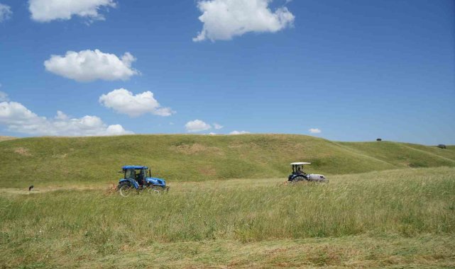 Tarım ve hayvancılığın önemli geçim kaynakları arasında yer aldığı kentte çiftçiler, yaz sıcağına rağmen hayvanların kışlık yem ihtiyacını karşılamak için yoğun çaba sarf ediyor. Günün ilk ışıklarıyla tarlaların yolunu tutan üreticiler, traktör yardımıyla biçtikleri otları daha sonra patoz yardımı ile saman haline getirerek kışa hazırlıyor.