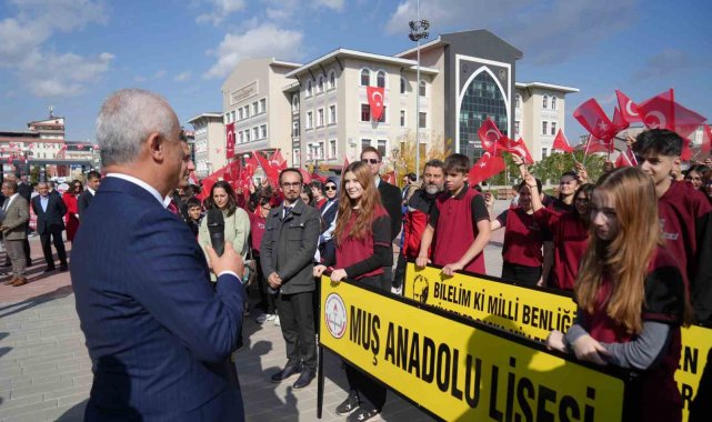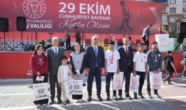 Kutlamalar, Muş Valisi Avni Çakır'ın valilik makamında tebrikleri kabul etmesiyle başladı. Ardından Kent Meydanı'nda devam eden törende, saygı duruşunda bulunuldu ve İstiklal Marşı okundu. Törende Cumhurbaşkanı Recep Tayyip Erdoğan'ın 29 Ekim Cumhuriyet Bayramı dolayısıyla yayımladığı mesaj okundu. Programda konuşan Vali Avni Çakır, Cumhuriyet'in milletin bağımsızlık mücadelesinin en büyük eseri olduğunu vurguladı. Çakır, "Geçmişten aldığımız güçle, geleceğe emin adımlarla yürürken; bağımsızlığın, milli iradenin ve yeniden doğuşun sembolü olan Cumhuriyetimizin 102. yıl dönümünü kutlamanın gururunu ve coşkusunu hep birlikte yaşıyoruz. 1071 Malazgirt Zaferi'nde Sultan Alparslan ve kahraman ordusu, canları pahasına kazandıkları o büyük zaferle bu toprakları bize ebedi bir vatan kılmış, Anadolu'nun kapılarını sonsuza dek açmıştır. İşte o ruh, o inanç ve kararlılık, Cumhuriyetimizin temelini oluşturan istiklal mücadelemize de ilham olmuştur. Bu kutlu gün, milletimizin azmiyle, inancıyla, fedakarlığıyla yazdığı büyük bir destanın yıldönümüdür. Cumhuriyet; Çanakkale'de, Sakarya'da, Dumlupınar'da can vererek kazanılan istiklalin, milletimizin iradesiyle taçlanmış halidir. Cumhuriyet, ortak değerimizdir. Tarih boyunca birçok büyük devlet kurmuş, gittiği her yere adalet, hoşgörü ve huzur götürmüş bir milletin evlatlarıyız. Malazgirt Ovası'nda atılan o ilk adım, yalnızca bir zafer değil; adaletin, hoşgörünün ve medeniyetin bu topraklara kök salmasının başlangıcıydı. O günün ruhu, bugün hala bizleri bir arada tutan, geleceğe umutla bakan en güçlü harcımızdır" dedi.