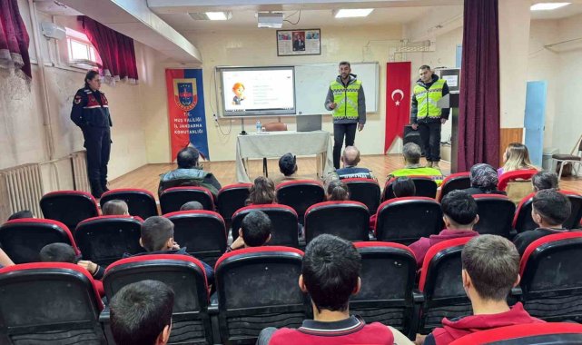 Muş İl Jandarma Komutanlığı ekipleri, Taşoluk İmam Hatip Ortaokulu'nda 23 öğrenciye kişisel güvenlik, suçtan korunma ve güvenli internet kullanımı konularında bilgilendirme yaptı.