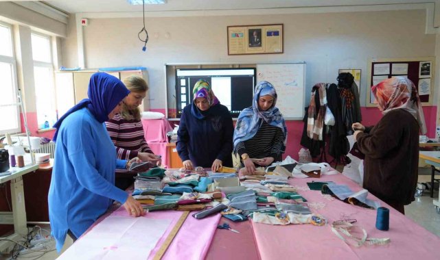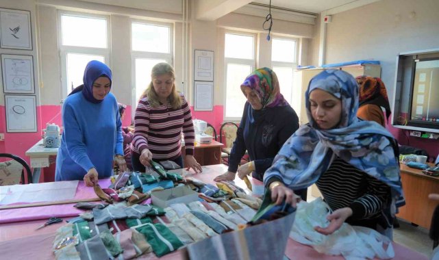 Halk Eğitim Merkezinde verilen el sanatları teknoloji kursuna katılan kadınlar, eğitimlerde kullanılan kumaşlardan arta kalan atıkları değerlendirmek amacıyla kalemlikler üretiyor. Gönüllü olarak yürüttükleri sosyal sorumluluk çalışması kapsamında hazırladıkları kalemlikleri köy okulundaki öğrencilere hediye eden kursiyerler, çocuklara sürpriz yapmak için kalemliklerin içine küçük hediyeler de yerleştiriyor. Kursiyer kadınlar, hem atık malzemeleri geri dönüştürerek ekonomiye katkı sağlamayı hem de çocukların yüzünü güldürmeyi amaçlıyorlar.