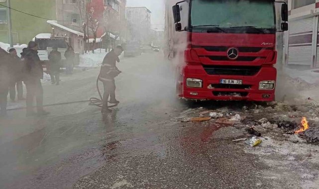 Muş'ta park halindeki bir tırın motor kısmında çıkan yangın, itfaiye ekiplerinin zamanında müdahalesiyle dorsesine sıçramadan söndürüldü.