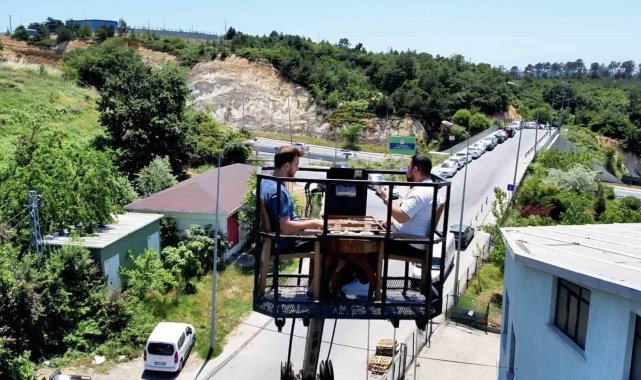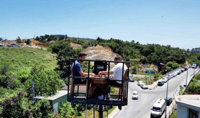 İstanbul'un Arnavutköy ilçesinde bir kafeye gelen 2 kişi teras manzarası isteyince kafe işletmecisiyle arasında geçen 'Vinç çağırayım mı?' diyaloğu gerçek oldu. Vinçle 40 metre yüksekliğe çıkan 2 müşteri, tavla oynayarak çay içti.