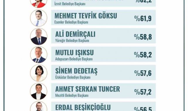 Türkiye genelinde yapılan ankette, Adapazarı Belediye Başkanı Mutlu Işıksu, vatandaş memnuniyeti oranında beşinci sırada yer aldı. ORC Araştırma Şirketi tarafından 5-16 Haziran 2025 tarihleri arasında 18 bin 200 kişiyle yapılan kamuoyu yoklamasında, Türkiye'nin en başarılı büyükşehir ilçe belediye başkanları belirlendi. Katılımcılara, kendi şehirlerinde görev yapan belediye başkanlarının performansını nasıl değerlendirdikleri soruldu. Mutlu Işıksu, hizmet kalitesi ve şehirdeki yaşam standartlarına katkılarıyla ankette yüzde 58,2'lik oyla beşinci sırada yer aldı.