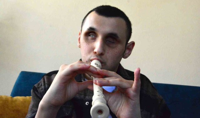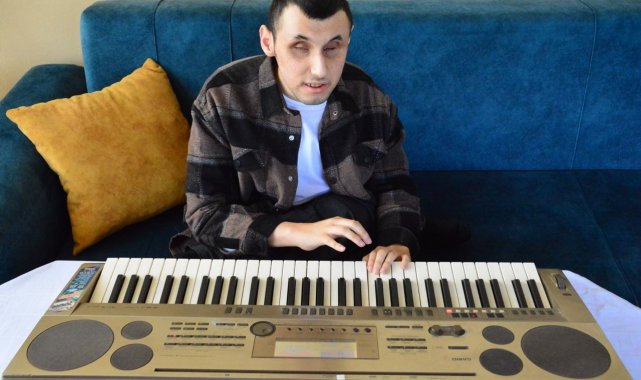Çorum'da doğuştan görme, bedensel engelli ve cam kemik hastası olan 24 yaşındaki genç, eğitim almadan kendi çabalarıyla 5 enstrüman çalmayı öğrendi.