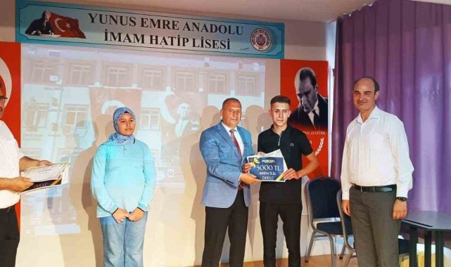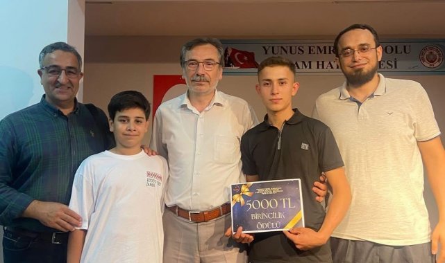 Manisa Yunus Emre Anadolu İmam Hatip Lisesi'nde düzenlenen yarışmada ödülünü alan İbrahim Müzaç, okuluna dönüşünde arkadaşları ve öğretmenleri tarafından coşkuyla karşılandı.