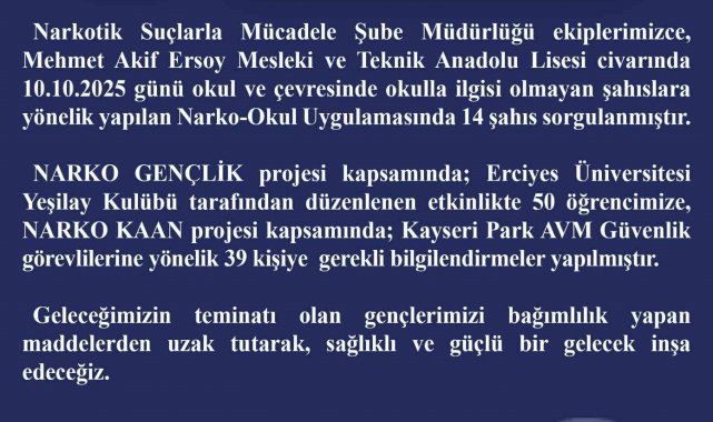 Kayseri İl Emniyet Müdürlüğü Narkotik Suçlarla Mücadele Şube Müdürlüğü ekipleri, Mehmet Akif Ersoy Mesleki ve Teknik Anadolu Lisesi çevresinde okulla ilgisi olmayan şahıslara yönelik çalışma yaptı. Ekipler Narko-Okul uygulaması kapsamında 14 şahıs sorguladı.