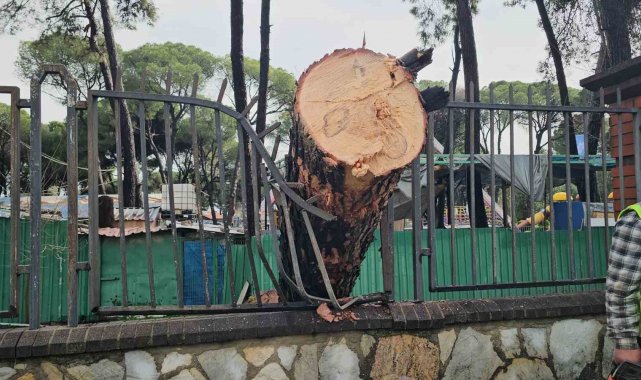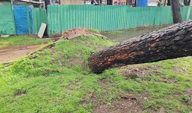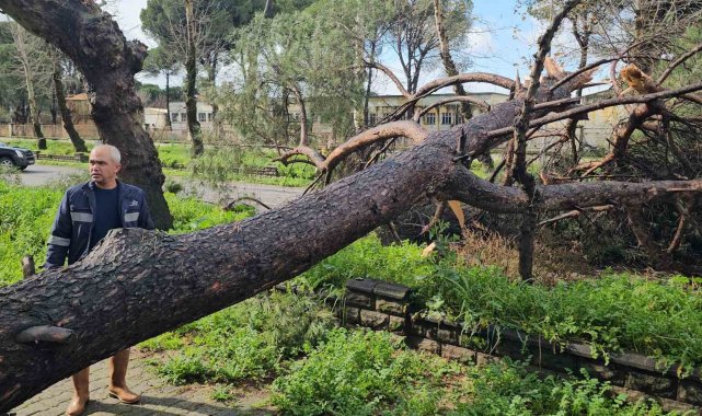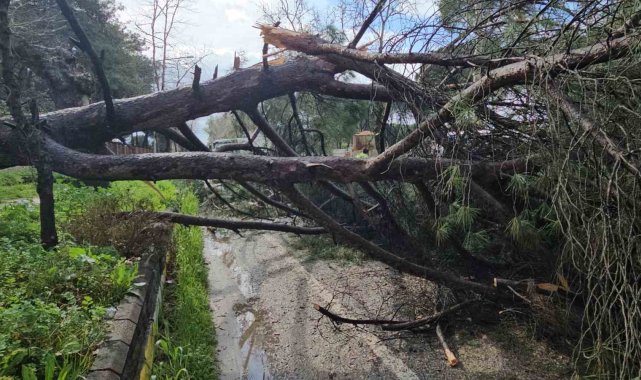 Nazilli'de fırtınayla devrilen dev çam ağacı karayolunu trafiğe kapadı