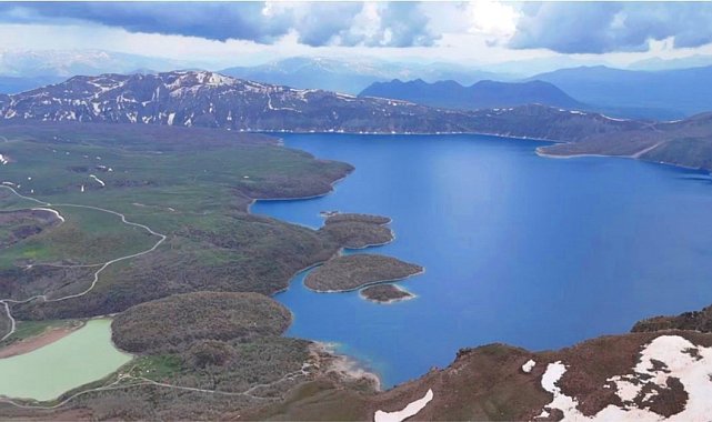 Bitlis'in Tatvan ilçesi sınırlarında yer alan ve dünyanın ikinci, Türkiye'nin ise en büyük krater gölü olma özelliğine sahip Nemrut Krater Gölü, dronla görüntülendi.