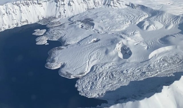 Bitlis'in Ahlat, Güroymak ve Tatvan ilçesi sınırlarında yer alan ve Türkiye'nin en büyük krater gölü olan Nemrut Krater Gölü, uçaktan çekilen kış görüntüleriyle hayran bıraktı.